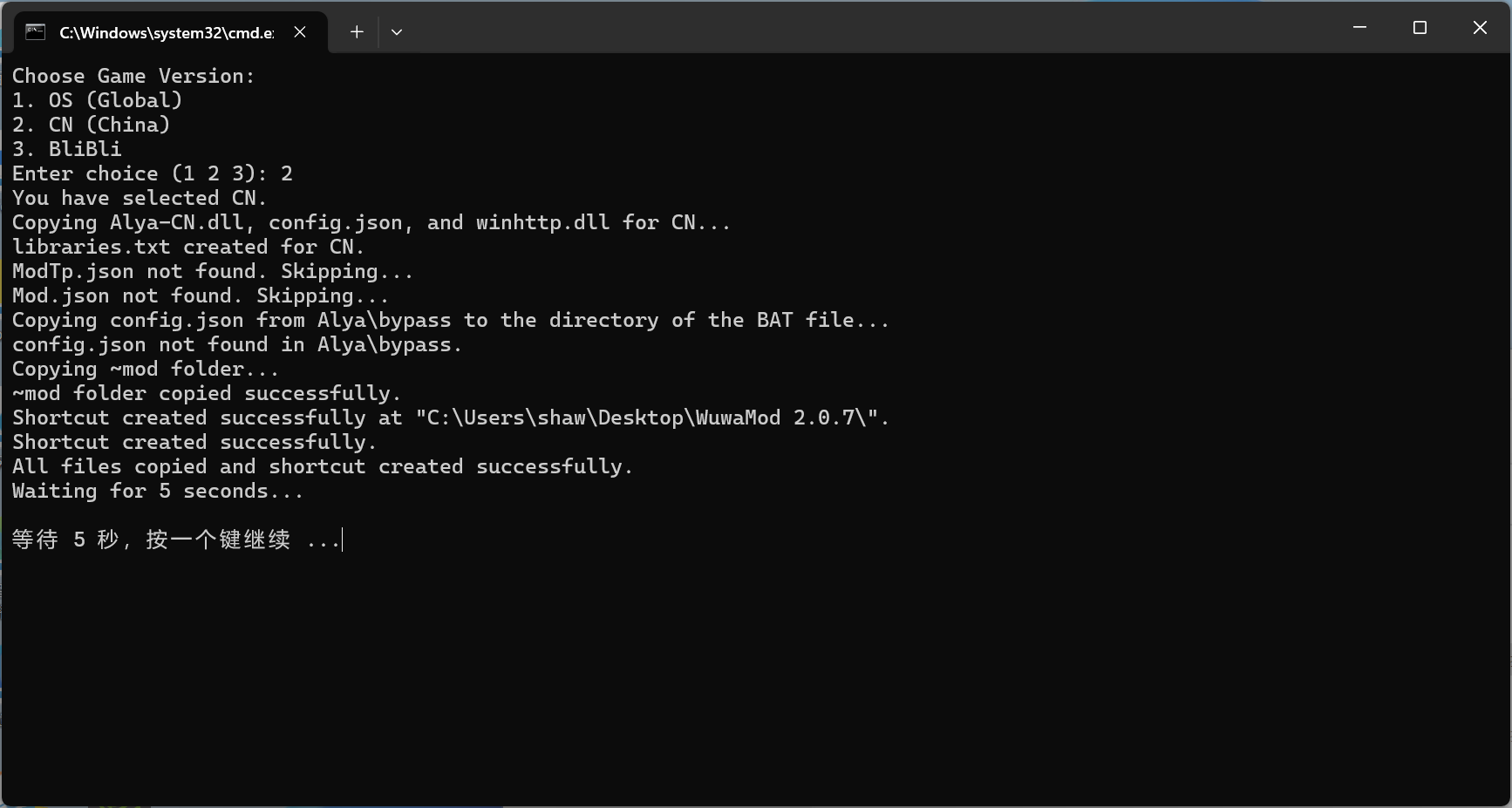 3.双击运行Install.bat(一定要双击运行,不可管理员方式运行),选择你对应的服务器,1为国际服,2为国服,3为B服。