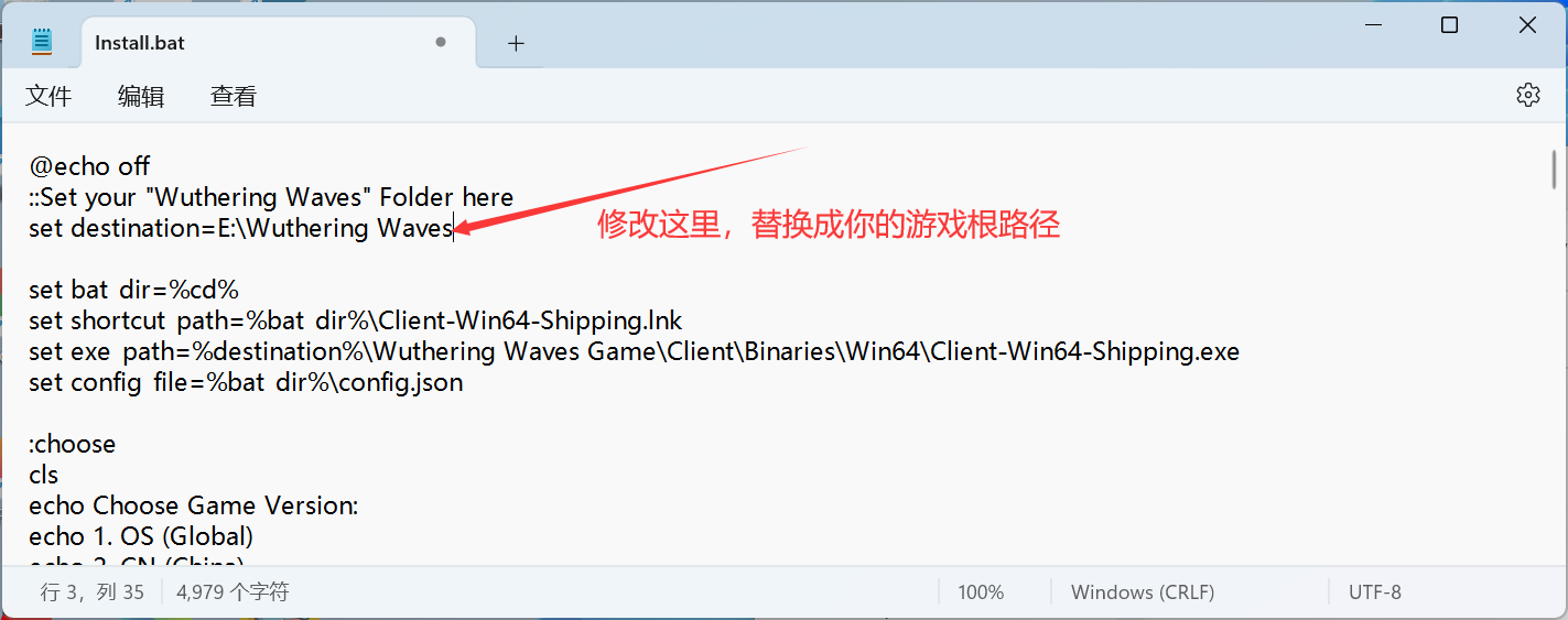 2.解压压缩包里面的文件,右击以文本方式打开“Install.bat”文件,用你复制的游戏根路径替换以下位置并且保存: